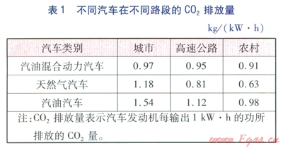 表1表明:a.在城市內(nèi)行駛,汽油混合動(dòng)力汽車是最清潔的。b.在農(nóng)村地區(qū)、高速公路上行駛時(shí)(車速快,發(fā)動(dòng)機(jī)工作),在二氧化碳減排方面,純天然氣汽車優(yōu)于汽油汽車、汽油混合動(dòng)力汽車。