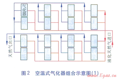 空溫式氣化器的臺數(shù)和氣化量,可跟據(jù)工程建設(shè)規(guī)模和用戶的要求綜合確定??諟厥綒饣鹘M合示意見圖2、3。