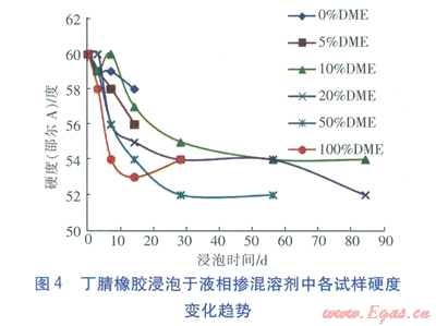 ①液相摻混溶劑對丁腈橡膠的硬度影響較小;總體上隨著浸泡時(shí)間的增長,硬度有所減小。
