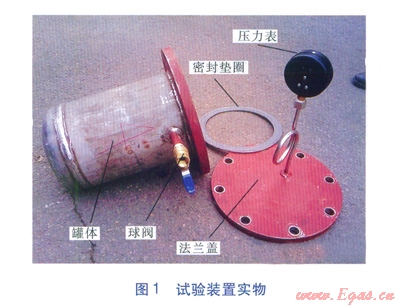 由于需進(jìn)行液相浸泡,試驗(yàn)所需裝置為壓力容器,參考LPG鋼瓶的設(shè)計(jì)壓力,將試驗(yàn)罐的設(shè)計(jì)壓力定為1.6MPa。試驗(yàn)裝置實(shí)物見圖1。