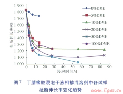 ②DME與LPG的液相對丁腈橡膠不同性能的影響不同。其中摻混液對丁腈橡膠的體積變化率影響最大,質(zhì)量變化率影響次之。對丁腈橡膠的壓縮永久變形量有一定影響,對扯斷伸長率及硬度等力學(xué)性能的影響較小。