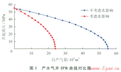 某水驅(qū)氣藏中1口氣井的實際生產(chǎn)資料、測壓資料、初期不產(chǎn)水時不穩(wěn)定試井解釋成果、井身資料和實驗室數(shù)據(jù)如下:井半徑0.1m,油管直徑88.9mm,產(chǎn)層厚度35.5m,地層中部溫度405.49K,氣體相對密度0.574,供給邊界半徑720m,表皮系數(shù)1.98,氣井深度4887.7m,滲透率l.356mD,目前地層壓力55.12MPa,產(chǎn)氣量5.6×104m3/d,產(chǎn)水量l8.9m3/d,井口油壓31.9MPa,平均偏差因子1.24,氣體平均黏度0.0365mPa·S。根據(jù)上述理論計算可得,目前生產(chǎn)條件下的井底流壓為48.4MPa,氣相滲透率為0.59mD??紤]水影響時,二項式產(chǎn)能方程系數(shù)A1為0.012365、Bl為1.10×10-9、無阻流量為24.06×104m3/d;不考慮水影響時,二項式產(chǎn)能方程系數(shù)A為0.005353、B為3.14×10-10、無阻流量為54.99×104m3/d。計算結(jié)果表明,地層中的氣水兩相流動使得氣井的無阻流量下降了56.25%??紤]及不考慮水影響的氣井流入動態(tài)關(guān)系曲線如圖1所示。