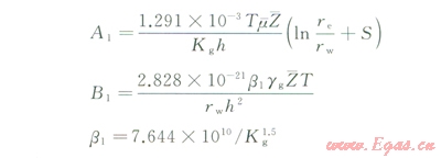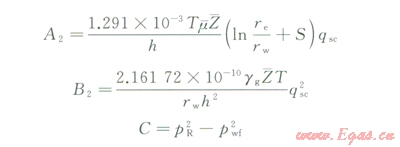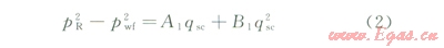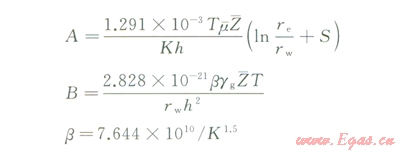 由氣水兩相流動時,氣井穩(wěn)定狀態(tài)條件下以壓力平方形式表示的氣相二項式產(chǎn)能方程式: