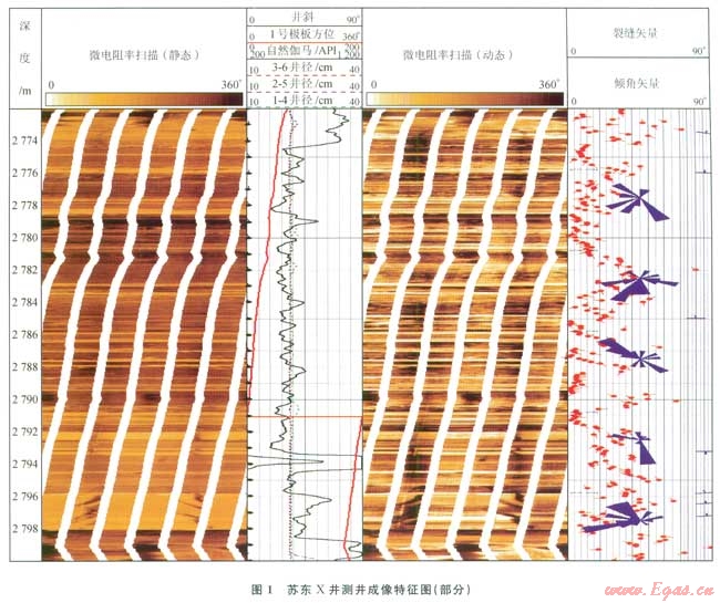從大量巖心觀察表明,蘇里格氣田主要發(fā)育高角度裂縫、垂直裂縫。同時(shí)廣泛分布的低角度斜層理在一定程度上也有利于網(wǎng)狀縫的形成。在顯微鏡下可見(jiàn)到微裂縫及破裂縫。從成像測(cè)井資料來(lái)看,發(fā)育有一定量的天然裂縫,就蘇東X井而言(圖1),盒8段發(fā)育天然裂縫l7條,平均0.068條/m;山l段共發(fā)育天然裂縫23條,平均0.276條/m??傮w來(lái)說(shuō),蘇里格氣田致密砂巖儲(chǔ)層天然裂縫部分發(fā)育。