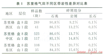 富含石英或者碳酸鹽巖等脆性礦物的儲(chǔ)層有利于產(chǎn)生復(fù)雜縫網(wǎng),沉積物源研究表明,山西一石盒子期,盆地北部存在兩大物源區(qū),西部為中元古界富石英物源區(qū);東部為太古界相對(duì)貧石英物源區(qū)。受物源控制,區(qū)帶間巖石類型存在明顯差異。蘇里格氣田由兩到東石英含量依次減少,巖屑含量依次增加。從石英含量來(lái)看,西區(qū)和中區(qū)石英含量相對(duì)較高,有利于實(shí)現(xiàn)體積壓裂(表1)。