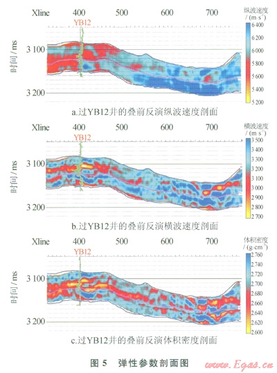 目前,各種地震疊前數(shù)據(jù)反演的軟件[16]。和疊前反演的方法[17-22]都比較成熟,通過較好的疊前三維地震資料可以較準(zhǔn)確地反演出縱波速度、橫波速度和體積密度等彈性參數(shù)。圖4為過YBl2井的原始疊后地震剖面。儲層位于圖中標(biāo)注的層位為下三疊統(tǒng)飛仙關(guān)組一段上二疊統(tǒng)長興組之間[23-25]。從剖面上可以看出地層的橫向變化大,分辨率低,信噪比較低等特征。圖5-a、b和c分別為應(yīng)用疊前同時反演方法獲得的縱波速度、橫波速度和體積密度反演剖面。從圖中可以看出,井旁道反演的數(shù)據(jù)與測井曲線的相關(guān)性較好。從反演數(shù)據(jù)剖面中可以發(fā)現(xiàn),疊前彈性參數(shù)反演獲得橫波速度數(shù)據(jù)和密度數(shù)據(jù)剖面的分辨率高于縱波速度數(shù)據(jù)剖面上的分辨率,為縱向高分辨率的孔隙度計(jì)算提供了條件。圖6為應(yīng)用本方法計(jì)算的過YB12井的孔隙度剖面。從圖6中還可以看出,計(jì)算孔隙度與實(shí)測孔隙度之間的相關(guān)性非常高,計(jì)算的孔隙度數(shù)據(jù)的分布范圍也與測井?dāng)?shù)據(jù)相當(dāng)吻合,并且從孔隙度剖面上能夠?qū)⒃搩佣畏譃樯舷聝商卓紫抖劝l(fā)育的儲層,孔隙度計(jì)算剖面上展布的橫向規(guī)律與地質(zhì)、鉆井認(rèn)識規(guī)律保持一致。因此,從孔隙度計(jì)算的結(jié)果可以看出,筆者提議的孔隙度計(jì)算方法在碳酸鹽巖儲層孔隙度計(jì)算中效果比較明顯,能夠較好地提高孔隙度計(jì)算的精確度。