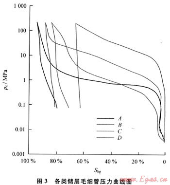 Ⅳ型:孔隙類型為粒內(nèi)溶孔以及裂縫組合,巖石類型主要為晶?;?guī)r、白云質(zhì)灰?guī)r和泥微晶灰?guī)r,毛細管壓力曲線為單峰細歪度,也呈明顯向左微凹的平臺狀(圖3中D曲線)。排驅(qū)壓力大于5.0MPa,中值壓力大于10.0MPa,孔隙度小于3%,滲透率小于0.01mD,為該區(qū)極差或無儲集能力的孔隙結構類型。