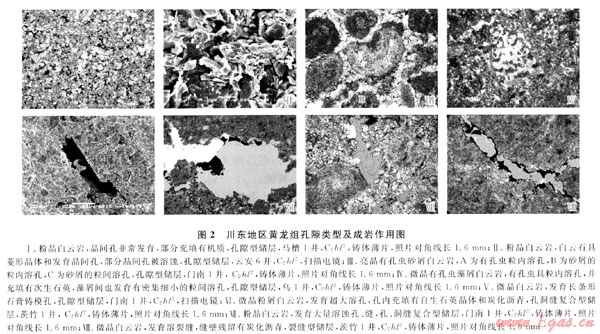 不同沉積微相和巖石類型的樣品物性分析資料,表明川東黃龍組碳酸鹽巖儲層中以粒屑灘相的顆粒白云巖、晶粒白云巖及白云質(zhì)巖溶角礫巖的物性為最好,以發(fā)育孔洞縫型和孔隙型儲層為主,而薩勃哈相的次生晶粒灰?guī)r、泥-微晶白云巖和開闊-局限海灣潮下相的泥-微晶灰?guī)r及膠結作用較強的巖溶角礫巖普遍很致密,僅局部發(fā)育有裂縫型儲層。