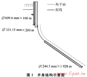 2) 井距很密,就要考慮表層預斜的方案。因此,在表層就要開始造斜,確保后面鉆井作業(yè)的安全,此時采用鉆具組合一定要注意:①一定要使用牙輪鉆頭;②要采用彎接頭馬達和陀螺的組合;③要確保造斜率,使預造斜在淺層就要成功。所采用的鉆具組合為: