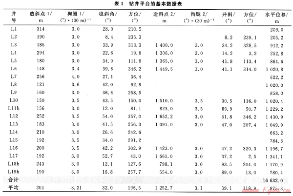 BH36油氣田經(jīng)過10多年的開發(fā)[1],已經(jīng)形成了一套海上叢式井鉆井技術體系[2~3]且逐漸步入開發(fā)的中后期,為有效提高剩余油氣的動用程度,提高采收率,通過實施細致的油氣藏工程分析,決定在原來350m×350m的開發(fā)井網(wǎng)中實施排狀加密。井口間距2.0m×2.0m,每個鉆井平臺總井數(shù)為16口,控制含油氣面積大約2km2,該油氣田垂深平均為1600m,平均井深在2000m左右。不難看出,在原井網(wǎng)中鉆再加密井網(wǎng)進行調(diào)整是海上油氣田開發(fā)所面臨的新課題。該區(qū)的井身結構如圖1所示,平臺的基本數(shù)據(jù)如表1所示。