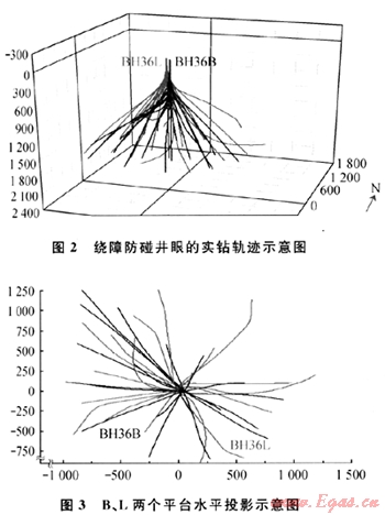對有可能井眼要發(fā)生干擾的井,全部采用陀螺復測井眼軌跡,并且全部要進行井眼鄰井程度分析和防碰掃描分析計算。通過對海上原平臺上的已鉆生產(chǎn)井的軌跡測量,了解和掌握了原井眼的準確位置,同時對于已鉆井和待鉆井的軌跡鄰近程度進行了分析。通過防碰掃描分析,可以看出:對相鄰的8平臺而言,在500~900m范圍內(nèi)井眼中心距在18~20m不等,而這一井段還是原平臺在200~550m造斜井段的井眼和方位變化最大的井段,要引起全面重視。圖2是原B平臺叢式井組與先加密現(xiàn)加密L平臺叢式井組示意圖(兩個平臺中心距45m),圖3則是兩個平臺水平投影示意圖。