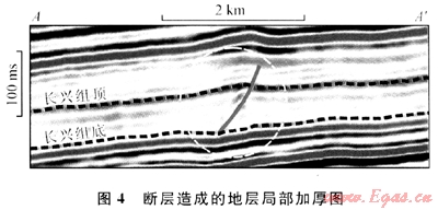值得注意的是,在頂帽變換結(jié)果圖(圖3-a)上,其西南角有一長(zhǎng)條狀高值異常區(qū)域,經(jīng)與地震剖面對(duì)比后確認(rèn)其為一小型逆斷層引起的地層局部加厚,并非礁體引起的厚度異常(圖4)。因此,頂帽變換預(yù)測(cè)的厚度高值異常區(qū),除了生物礁外,還可能為斷層等其他因素引起。