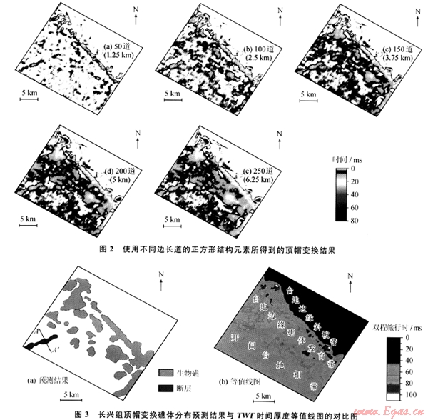 筆者根據(jù)地震解釋獲得的含生物礁地層的時(shí)間厚度數(shù)據(jù),利用礁相沉積厚度較同期非礁相地層大這一簡(jiǎn)單的沉積地質(zhì)學(xué)原理,應(yīng)用數(shù)字形態(tài)學(xué)中的頂帽變換方法開展生物礁分布預(yù)測(cè)。應(yīng)用于四川盆地北部J地區(qū)上二疊統(tǒng)長(zhǎng)興組礁體分布預(yù)測(cè),取得滿意效果。與人工地震相分析方法相比,該方法具有準(zhǔn)確、快速高效和定量化等優(yōu)點(diǎn)。在實(shí)際應(yīng)用中需要注意的是,結(jié)構(gòu)元素尺寸的選擇應(yīng)與實(shí)際地質(zhì)體的大小相符,結(jié)構(gòu)元素的尺寸過大或過小,均可能導(dǎo)致預(yù)測(cè)結(jié)果的偏差。此外,斷層發(fā)育等因素可能導(dǎo)致地層厚度出現(xiàn)異常,進(jìn)而影響頂帽變換結(jié)果,對(duì)此需予以區(qū)分。筆者所用的方法適用于構(gòu)造變形程度較弱的碳酸鹽巖地層中礁體的分布預(yù)測(cè)。
