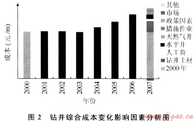 2) 造成鉆井成本上升的因素包括人工及主要材料價格上漲、鉆井工藝變化、政策調(diào)整、管理等多個方面,其中人工及主材價格上漲、鉆井工藝變化是造成鉆井成本上升的主要因素。
