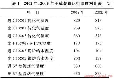 2002年(蒸汽系統(tǒng)能自平衡)、2009年(進(jìn)轉(zhuǎn)化爐對流段5#盤管煙氣溫度650℃)甲醇裝置運(yùn)行參數(shù)如表1所示。