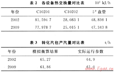 比較表3中轉(zhuǎn)化汽包模擬產(chǎn)汽量和實(shí)際產(chǎn)汽量,可判斷:C10201、C10202、5#盤管以及相應(yīng)的管道存在一定的熱損失,且2009年的熱損失明顯高于2002年,這是設(shè)備、管道的保溫效率下降所導(dǎo)致的。