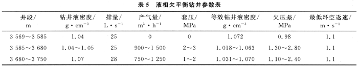 2) 提高了機(jī)械鉆速,延長鉆頭壽命。欠平衡鉆進(jìn)過程中,鉆井液循環(huán)壓力低于地層壓力,消除了正壓差對巖屑的壓持效應(yīng),避免了巖石的重復(fù)研磨,提高了機(jī)械鉆速,延長了鉆頭壽命。欠平衡井段3569.2~3750.0m,進(jìn)尺180.80m,純鉆進(jìn)86.67h,平均機(jī)械鉆速2.09m/h,使用萬216mm牙輪鉆頭一只,鉆時超過6m/h的段長就有31m。