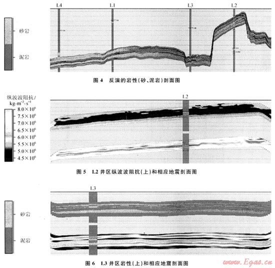 對比圖1~4,可以看出疊前隨機反演結果的垂直分辨率較疊前AVA同步反演結果有很大提高,地震資料無法分辨的L2井區(qū)的兩套薄砂層(圖5)和L3井區(qū)的砂泥互層(圖6)在反演結果中均表現(xiàn)十分清楚。該氣組儲層是低水位期在內陸架環(huán)境中形成的近源風暴席狀沙沉積,分布較穩(wěn)定。而反演結果中儲層橫向連續(xù)性也很好,符合該區(qū)的沉積相分布特征;同時上下層位的接觸關系與原始地震資料也吻合很好,進一步驗證了預測的可靠性。反演成果在該氣田的開發(fā)井設計優(yōu)化中得到了實際應用,并為今后的氣田開發(fā)實施提供了有力的資料,有利于降低開發(fā)風險、提高效率。