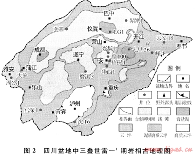 1) 中三疊世雷口坡期四川盆地為障壁蒸發(fā)漏湖沉積,由雷一-雷四期,膏鹽湖中心從川中南充地區(qū),逐漸擴(kuò)大至簡(jiǎn)陽,最后遷移至鹽亭蒲西地區(qū),圍繞膏鹽湖分布白云巖坪及顆粒灘。
