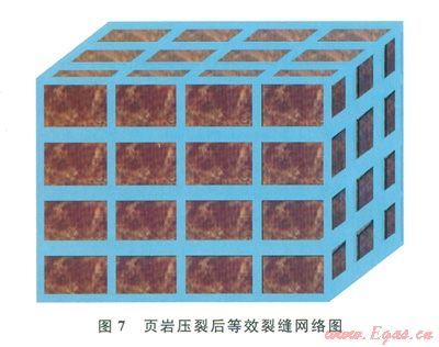 頁(yè)巖氣有效開(kāi)發(fā)的前提就是頁(yè)巖儲(chǔ)層的大規(guī)模壓裂(體積壓裂),目的是形成復(fù)雜的裂縫網(wǎng)絡(luò),大大改善頁(yè)巖儲(chǔ)層的滲流能力。假設(shè)圖7所示的裂縫網(wǎng)絡(luò)等效整體壓裂后頁(yè)巖儲(chǔ)層的實(shí)際裂縫網(wǎng)絡(luò),壓裂裂縫寬度為w(m),小頁(yè)巖塊的長(zhǎng)、寬、高均為a(m),則每個(gè)小頁(yè)巖塊的表面積為S=6a2(m2),每個(gè)頁(yè)巖塊所控制的裂縫體積約為V=3a2w.忽略井筒中殘留的壓裂液,則每個(gè)小頁(yè)巖塊吸水百分比為: