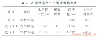 目前頁(yè)巖氣藏通常采用“低砂比”體積壓裂,裂縫寬度相對(duì)更小,因此頁(yè)巖氣藏返排時(shí)間長(zhǎng),返排率低是客觀必然。表2是某頁(yè)巖氣藏氣井的壓裂液返排數(shù)據(jù),可以看到商井的返排率最高,水平井水平段越長(zhǎng),壓裂規(guī)模越大,返排率越低。這與上面認(rèn)識(shí)一致,即壓力規(guī)模小,壓裂液更集中在井底附近的大尺度網(wǎng)絡(luò)縫隙中,返排率相對(duì)較高;壓裂規(guī)模入,壓裂液更多地分散在小尺度縫網(wǎng)中,返排率更低。