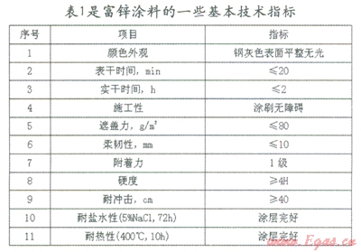 該富鋅涂料是一種雙組分的涂料,其特點是無毒、無嗅、水性、不可燃,常溫固化速度快,涂膜致密。對金屬表面的要求是表面處理達到工業(yè)級即Sa2.5級,表面粗糙度(25~40)mm,可在潮濕的表面施工,必須避免油污。