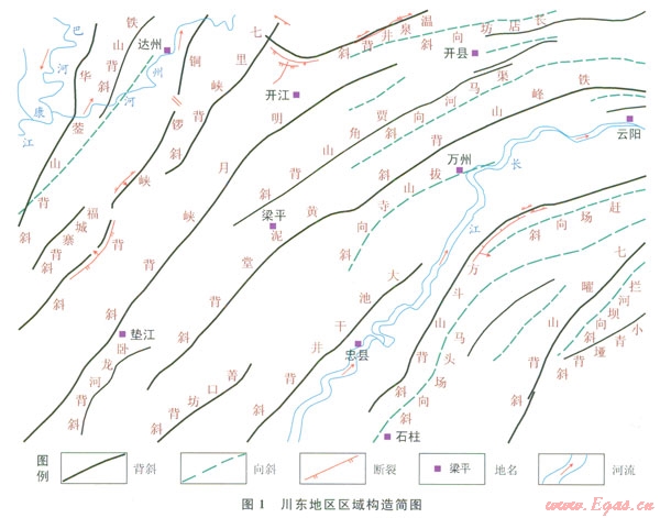 四川盆地東部地區(qū)(以下簡稱川東地區(qū))構(gòu)造位置隸屬于川東高陡構(gòu)造帶[1],發(fā)育一系列北東西南向延伸和隔擋式分布的大型復(fù)背斜和復(fù)向斜(圖1)。背斜核部主要出露下三疊統(tǒng)嘉陵江組,背斜兩翼至向斜核部依次出露中三疊統(tǒng)雷口坡組,上三疊統(tǒng)須家河組,下侏羅統(tǒng)自流井組,中侏羅統(tǒng)新田溝組、沙溪廟組及上侏羅統(tǒng)遂寧組和蓬萊鎮(zhèn)組等地層。順背斜核部走向,發(fā)育有多條疊瓦狀分布的逆斷層,斷面傾北西,被斷層切割的斷背斜南東翼陡,北西翼緩。川東地區(qū)是四川盆地最重要的滅然氣產(chǎn)地之一,從石炭系黃龍組至三疊系須家河組,于海相的碳酸鹽巖和陸相的碎屑巖地層中,發(fā)育有多套含氣層系和眾多大、中型氣陽,已開發(fā)氣田多位于高陡背斜構(gòu)造帶[1-5],而近期在梁甲與萬州交界處的拔山寺向斜南段,于下侏羅統(tǒng)自流井組大安寨段湖相黑色頁巖夾薄層介殼灰?guī)r組合中,有多口鉆井鉆獲中、高產(chǎn)油氣流,是繼川中和川北地區(qū)之后,在川東地區(qū)大安寨段非常規(guī)油氣藏勘探取得的重大進展,不僅顯示了川東地區(qū)大安寨段具備良好的貞巖氣(油)成藏條件和勘探潛力[6-10],同時開拓了該地區(qū)高陡構(gòu)造帶向斜構(gòu)造部位非常規(guī)油氣藏勘探的新領(lǐng)域。