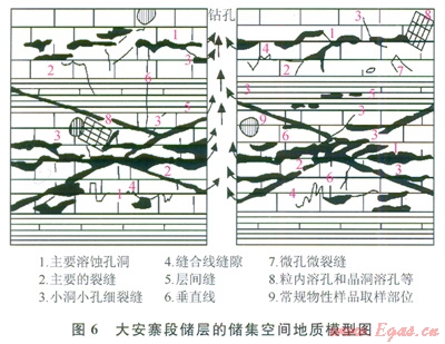 圖6為綜合上述各項儲集空間特征的儲層地質(zhì)模型[19],從中不難確定,對大安寨段儲層貢獻最大的無疑是各類裂縫及沿裂縫溶蝕形成的各類溶縫、溶孔和溶洞,其次為晶間孔,溶蝕微孔和微縫雖然很小,但數(shù)量眾多,其貢獻也不容忽視。