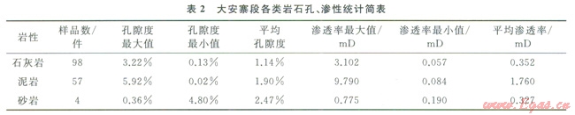 大安寨段主體以石灰?guī)r和頁巖為主,部分為過渡類型的泥質(zhì)灰?guī)r和鈣質(zhì)泥巖,少量為粉一細粒砂巖。從孔、滲性統(tǒng)計結(jié)果(表2),可以看出,大安寨段砂巖的平均孔隙度相對較高,為2.47%,但滲透率最低為0.327mD,石灰?guī)r孔隙度和滲透率都為最低,平均值分別為1.14%和0.352mD,而泥頁巖的平均孔隙度居中,為1.9%,平均滲透率則高達l.76mD。由此可以看出,大安寨段中最有利儲層發(fā)育的巖性并非為石灰?guī)r和砂巖,近期的勘探實踐也證明了大安寨段儲層的發(fā)育特征,表現(xiàn)出有悖于常規(guī)石油地質(zhì)理論的3大特點:①介殼灰?guī)r的物性有隨石灰?guī)r中泥質(zhì)含量增加,孔隙度雖然變化不大,而滲透率卻趨于上升的特點,原因可能在于介殼灰?guī)r中的泥質(zhì)在成巖過程中具有收縮作用,有利于粒緣和粒間成巖收縮縫的發(fā)育;②大安寨段儲層并非為單一巖石類型,而是各類石灰?guī)r,特別是泥質(zhì)介殼灰?guī)r與碳質(zhì)頁巖的不等厚互層組合體,無論是在剖面上還是平面上(圖2、3),都位于偏向半深湖一側(cè)的介殼灘灘緣和湖坡帶,具有較穩(wěn)定的層位和較大分布范圍;③介殼灰?guī)r與碳質(zhì)頁巖互層組合體中,滲透率隨著頁巖夾層增多加厚而趨于降低,說明組合體中頁巖夾層過多也不利于儲層發(fā)育。
