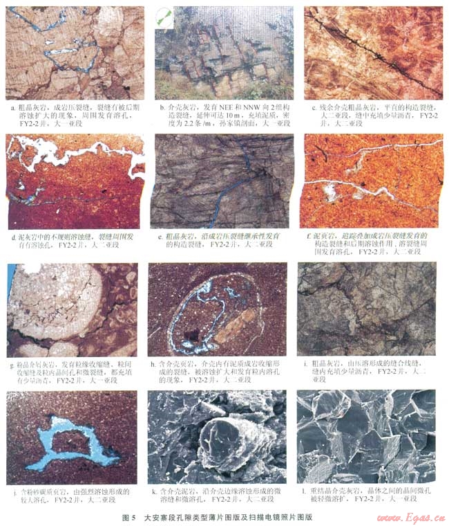 根據(jù)地表露頭、巖心、薄片和掃描電鏡的觀察和描述結(jié)果,發(fā)現(xiàn)大安寨段微米級以上的原生孔隙大部分已消失,無疑與大安寨段經(jīng)歷了強烈的壓實、壓溶和新生變形作用有關(guān)。就宏觀的儲集空間類型而言,主體以裂縫為主,含少量微米毫米級的溶蝕孔、洞、縫和重結(jié)晶形成的晶間微孔。