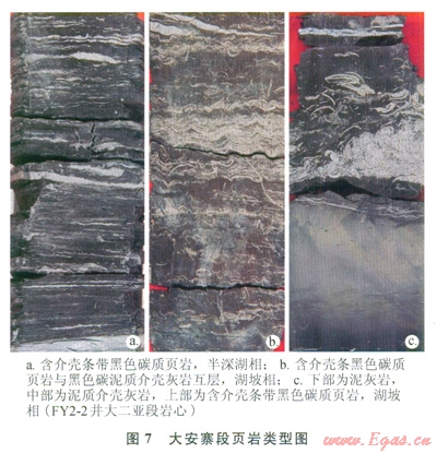 大安寨段頁巖類型豐富,而具備成藏條件的頁巖主體為半深湖—湖坡相的薄層狀暗色碳質(zhì)頁巖,頁巖中往往含介殼條帶或夾有薄層狀黑色碳泥質(zhì)介殼灰?guī)r(圖7),而淺湖、濱湖相的灰色和雜色頁巖、粉砂質(zhì)頁巖、鈣質(zhì)頁巖等不具備頁巖氣成藏條件。碳質(zhì)頁巖厚度對頁巖氣的勘探開發(fā)具有重要意義,特點為:①大一亞段碳質(zhì)頁巖主要出現(xiàn)在下部,為與薄層碳泥質(zhì)介殼灰?guī)r互層組合,碳質(zhì)頁巖的累計厚度為8~12m;②大二亞段由大套碳質(zhì)頁巖夾泥質(zhì)介殼灰?guī)r條帶或薄層組成,單層頁巖的厚度一般不超過2m,累計厚度為30~50m;③大三亞段碳質(zhì)頁巖出現(xiàn)在上部,也為與薄層碳泥質(zhì)介殼灰?guī)r互層組合,碳質(zhì)頁巖的累計厚度很小,僅為2~5m。需指出的是,大安寨段碳質(zhì)頁巖的發(fā)育不僅具有從大三亞段上部經(jīng)大二亞段至大一亞段下部的連續(xù)沉積特點(圖2),而且40~60m的總累計厚度在湖坡和半深湖亞相區(qū)(圖3、4)范圍內(nèi)的分布非常穩(wěn)定,對照美國密執(zhí)安盆地Antrim頁巖氣藏最小頁巖厚度僅為9.1m,特沃斯盆地Barnett頁巖氣藏30.5m的頁巖厚度已被證明具有商業(yè)開采價值的現(xiàn)狀[21],該區(qū)大安寨碳質(zhì)頁巖的厚度已完全具備形成頁巖氣藏的條件。