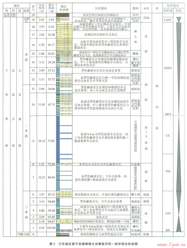 1)川東地區(qū)大安寨段為淡水湖泊沉積體系,發(fā)育濱湖、淺湖、湖坡和深—半深湖4種亞相,對應(yīng)完整的湖侵湖退旋回過程,可劃分為低位、湖侵、早期高位和晚期高位4個沉積體系域。