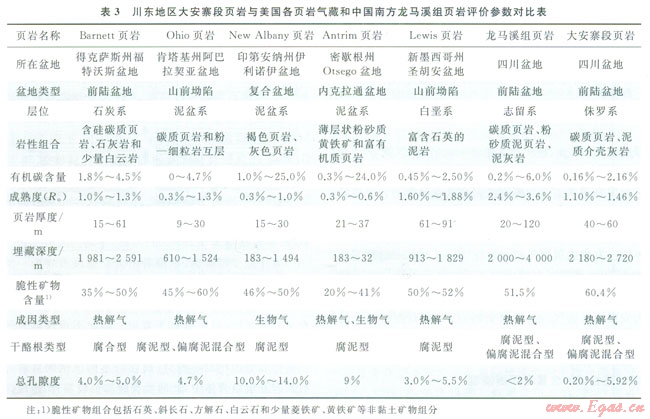 鑒于目前國內(nèi)外還沒有形成頁巖氣(油)藏的評價標(biāo)準(zhǔn),筆者以美國Barnett頁巖和Ohio頁巖氣藏勘探經(jīng)驗為指導(dǎo)[28],結(jié)合川東地區(qū)大安寨段頁巖TOC較高、類型較好,演化程度適中、累計厚度較大、分布范圍廣而穩(wěn)定、埋藏深度適中、脆性礦物含量高和具有較好—好的烴源巖性質(zhì)等特征,與美國眾多頁巖氣盆地和中國南方頁巖氣勘探近期取得突破性進展的志留系龍馬溪組頁巖[26]各項參數(shù)進行對比(表3),同時考慮川東地區(qū)大安寨段頁巖分布而積都超過2000km2,地質(zhì)歷史中始終深埋地腹而未被剝蝕,地表條件以地形高差相對較小丘陵和中山為主,大、小江河密集分布,水資源豐富及交通便利等相關(guān)的輔要條件,對川東地區(qū)大安寨段頁巖氣(油)成藏條件和資源潛力進行綜合評價。結(jié)果認為:該地區(qū)大安寨段頁巖具備非常優(yōu)越的頁巖氣(油)成藏條件。
