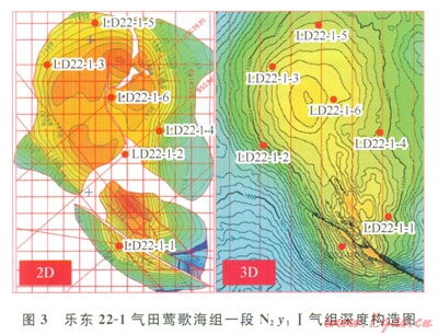 樂東22-l氣田三維地震解釋與二維解釋的構(gòu)造認(rèn)識(shí)發(fā)生了較大變化,以N1y2Ⅰ,工氣組為例,原二維資料解釋存在“Y”形斷層,但在三維資料解釋后斷層并不存在(圖3)。另外,三維地震解釋后部分主力氣組的構(gòu)造高點(diǎn)和幅度也發(fā)生了明顯的變化。為了減少構(gòu)造對(duì)氣田開發(fā)的影響,進(jìn)行了儲(chǔ)層精細(xì)描述,并以此來優(yōu)選井位和指導(dǎo)隨鉆井軌跡調(diào)整,為氣田開發(fā)成功實(shí)施奠定了基礎(chǔ)。