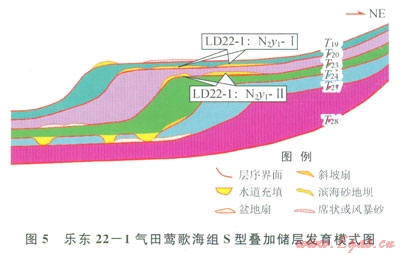 樂東22-1氣田主物源來自北東方向的海南島,為發(fā)育在陸架濱 淺海背景下,受沉積坡折控制的灘壩復(fù)合體沉積。儲(chǔ)層的形成,與海平面短期快速升降、強(qiáng)制性海退背景下形成的4級(jí)層序有關(guān)。4級(jí)層序界面以類工型界面為主,層序結(jié)構(gòu)主要表現(xiàn)為前積型特征,頂積層較薄(圖4)。S型疊加4級(jí)層序的頂積層可形成良好的儲(chǔ)集層,在沉積坡折以下多以淺海相泥巖、泥質(zhì)粉砂巖為主,儲(chǔ)層不發(fā)育(圖5)。準(zhǔn)確把握層序形成機(jī)制和疊加樣式[7-8],可以有效地預(yù)測(cè)和把握有利儲(chǔ)層的分布,減少儲(chǔ)層預(yù)測(cè)上的失誤,降低風(fēng)險(xiǎn)。通過對(duì)儲(chǔ)層的精細(xì)描述,刻畫有利砂體的展布,指導(dǎo)生產(chǎn)井的部署和井位優(yōu)化。