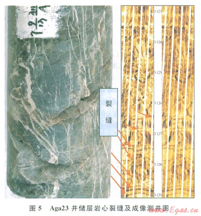 別什肯特坳陷與基薩爾褶皺隆起區(qū)新牛代擠壓作用強(qiáng),發(fā)育了大量的逆沖斷裂,在上侏羅統(tǒng)卡洛犬階牛津階碳酸鹽巖儲層中形成的大量構(gòu)造裂縫,如別什肯特坳陷Aga23井的巖心及成像測井表明,靠近斷裂高角度及斜交裂縫發(fā)育,存在北西向和北東向2組小尺度裂縫(圖5)。別什肯特坳陷上侏羅統(tǒng)卡洛夫階—牛津階碳酸鹽巖是深水盆地相[14],儲層巖性較致密,平均孔隙度介于3.5%~3.8%,平均滲透率為0.09mD,儲層物性較差,裂縫的發(fā)育改造了儲層的儲滲性能,增加了滲透性。因此,北西走向的基底斷裂與北東走向的晚期斷裂相交地區(qū),是儲層發(fā)育的有利區(qū)。