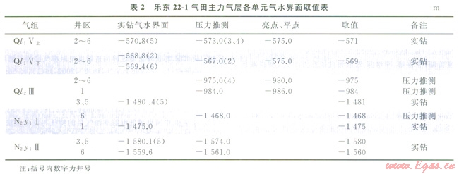 由于含氣砂巖明顯的低速特征,在模糊區(qū)之外氣層的亮點(diǎn)或極性反轉(zhuǎn)等都非常清楚(圖5)。在南區(qū)可以看到氣層的平點(diǎn)特征,而薄層一般可見(jiàn)明顯的極性反轉(zhuǎn)現(xiàn)象。實(shí)鉆資料和壓力推算證實(shí),這一地震信息是可以確定各氣藏的含氣范圍的。如Ql1V上氣組的氣水界面,壓力推測(cè)為-573m,亮點(diǎn)為-575m,實(shí)鉆為-570.8m,基本一致(表2);另外,利用試井分析結(jié)果明確斷層位置,確定合理含氣范圍。如N2y1I氣組6井區(qū)和3、5井區(qū)兩個(gè)單元經(jīng)井證實(shí)氣水界面和氣體組分均有差異,但由于模糊區(qū)的存在,兩個(gè)井區(qū)之間疑似有一條走向近南北的斷層,通過(guò)2、6井的試井解釋?zhuān)@示有不滲透邊界的存在,證實(shí)了“模糊區(qū)”內(nèi)F4斷層的存在,為合理確定這兩個(gè)計(jì)算單元的含氣范圍提供了依據(jù)。