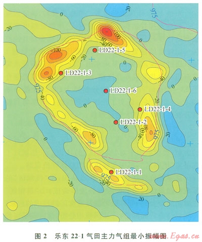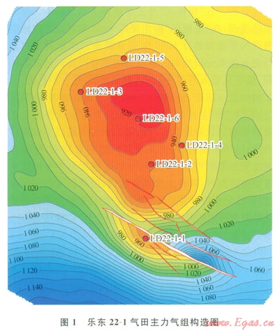 樂(lè)東22-1構(gòu)造是基于1993年采集的二維地震資料解釋發(fā)現(xiàn)的,但是由于受模糊區(qū)的影響,當(dāng)時(shí)所解釋的構(gòu)造全區(qū)呈“U”形,“U”形范圍內(nèi)地震資料有屬性異常,如該異常代表含氣,則該氣田應(yīng)屬巖性圈閉氣藏。最終通過(guò)6口探井的鉆探,同時(shí)在評(píng)價(jià)期間還增加了高分辨率二維地震資料,落實(shí)該氣田主體是一相對(duì)完整的大中型穹隆背斜圈閉(圖1)。
