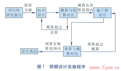 限額設(shè)計是按照批準(zhǔn)的可行性研究報告和投資估算控制初步設(shè)計,按照批準(zhǔn)的初步設(shè)計總概算控制施工圖設(shè)計,保證總概算不被突破。限額設(shè)計實施程序見圖1。