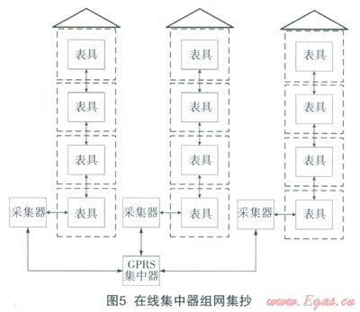 本方式通過(guò)小區(qū)內(nèi)加裝GPRS集中器,南集中器控制多個(gè)樓棟的采集器發(fā)起組網(wǎng)集抄。采集器根據(jù)集中器的命令,發(fā)起和中繼器、表具的組網(wǎng)過(guò)程并回傳數(shù)據(jù)。組網(wǎng)方式和現(xiàn)場(chǎng)組網(wǎng)集抄方式相同,唯一的不同在于不需要抄表人員到現(xiàn)場(chǎng)用于持機(jī)發(fā)起集抄,(見(jiàn)圖5)。