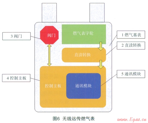 無(wú)線遠(yuǎn)傳燃?xì)獗硎窃谄胀矣闷つと細(xì)獗砩霞友b光電直讀計(jì)數(shù)器、電子控制模塊、無(wú)線通訊模塊等電子模塊組成的,如圖6所示,無(wú)線遠(yuǎn)傳燃?xì)獗戆惭b在用戶(hù)家中,燃?xì)夤疽詿o(wú)線手持機(jī)或者采集器為無(wú)線數(shù)據(jù)傳輸媒介,對(duì)燃?xì)獗韺?shí)行戶(hù)外實(shí)時(shí)抄表和遠(yuǎn)程閥門(mén)控制。主要功能包括以下幾點(diǎn):