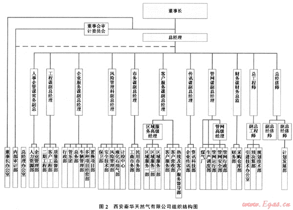 架構(gòu)重組后的部門設(shè)置以“使客戶滿意的流程”為中心,把同類業(yè)務(wù)整合到一起,這樣可以強(qiáng)化專業(yè)化管理,優(yōu)化專業(yè)技術(shù);優(yōu)化人力資源,減少勞動(dòng)定員,避免同一專業(yè)崗位工作忙閑不均的問(wèn)題;減少開(kāi)資。降低消耗。提高極具設(shè)備、原材料、能源、技術(shù)等各種資源的綜合利用水平。重組后的西安秦華天然氣有限公司組織結(jié)構(gòu)圖如圖2所示。