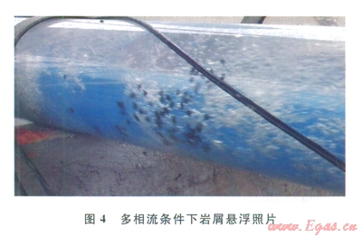 懸浮是巖屑顆粒運(yùn)動(dòng)的重要方式,引起巖屑顆粒懸浮的主要因素是紊動(dòng)作用(圖3)。懸浮運(yùn)動(dòng)的形式是隨鉆井液漂流,懸浮運(yùn)動(dòng)時(shí)受到2種力的作用:①重力,使巖屑顆粒向下井壁沉降;②氣液兩相流推動(dòng)力,使巖屑顆粒沿井筒向下游運(yùn)動(dòng)。巖屑顆粒向下游運(yùn)動(dòng)的速度與氣液兩相流速度有關(guān),巖屑顆粒輸送量可間接代表巖屑顆粒向下游運(yùn)動(dòng)的速度,流量越大,可帶走的巖屑顆粒量也越多。懸浮顆粒在沉降過(guò)程中被渦流帶回上層,使巖屑顆粒上下漂移,沉降速度變慢,巖屑懸浮照片如圖4所示。