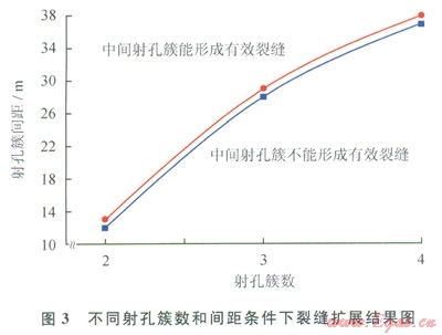 假設(shè)中間射孔簇形成的壓裂裂縫長度達到兩端裂縫的一半以上,認為中間裂縫形成了有效裂縫。不同射孔簇數(shù)、簇間距條件下的裂縫擴展情況如圖3所示,從圖3可以看出:射孔簇數(shù)增加,能形成有效裂縫的極限間距增加,且增加幅度較大;射孔簇數(shù)為2簇,極限干擾距離為13.0m;射孔簇數(shù)增加到4簇,極限十擾距離增加到38.0m。