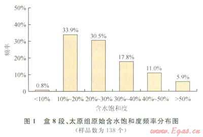 儲層原始含水飽和度由密閉取心井確定。通過統(tǒng)計(jì)、分析盆地東部3口密閉取心井盒8段、太原組的138個(gè)原始含水飽和度數(shù)據(jù),結(jié)果表明,盒8段、太原組的原始含水飽和度主要分布在40%以下,累計(jì)頻率町達(dá)83.1%,平均含水飽和度為26.7%(圖1)。具有較低的原始含水飽和度特征。