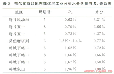 水在煤中的賦存狀態(tài)分為外在水分、內(nèi)在水分以及同煤中礦物質(zhì)結(jié)合的結(jié)晶水。煤層工業(yè)分析水分含量是指煤層中的內(nèi)在水分,內(nèi)在水分是指吸附或凝聚在煤顆粒內(nèi)部毛細(xì)孔中的水。通過對鄂爾多斯盆地東部煤層工業(yè)分析水分含量與有機(jī)質(zhì)成熟度(R。)關(guān)系時(shí)發(fā)現(xiàn)(表3),在R。>1.2%時(shí),煤中水分含量明顯降低,預(yù)示著后期烴源巖中生成的天然氣中水蒸氣的含量越少,并處在欠飽和狀態(tài),而該區(qū)上古生界煤系烴源巖演化程度普遍達(dá)到高成熟和過成熟階段,在天然氣成藏后期會有更多的干氣注入儲層,導(dǎo)致儲層中的束縛水蒸發(fā)遷移,有利于形成超低含水飽和度氣藏。