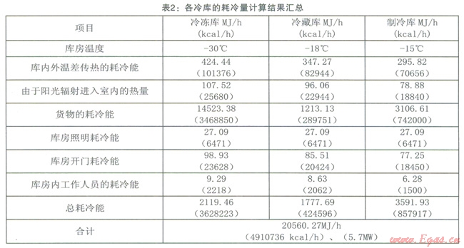 每個(gè)工作人員產(chǎn)生的熱量與庫房溫度有關(guān)。凍結(jié)間按l.59MJ/h(355kcal/h),低溫冷藏間按1.26MJ/h(300kcal/h),高溫冷藏庫按1.00MJ/h(240kcal/h)考慮。工作人員按50人考慮。計(jì)算可得三座冷庫庫房?jī)?nèi)工作人員產(chǎn)生的耗冷量分別為9.29MJ/h、8.63MJ/h、6.28MJ/h(2218kCal/h、2062kCal/h、1500kcal/h)。將各個(gè)冷庫耗冷量的計(jì)算結(jié)果匯總,列于表2。