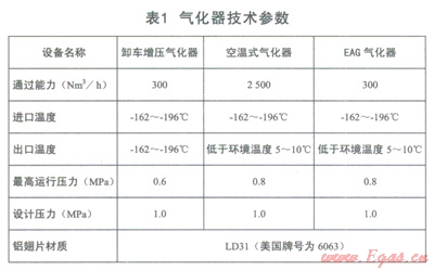 (1)卸車增壓氣化器、空溫式氣化器、EAG氣化器(技術參數見表l)。