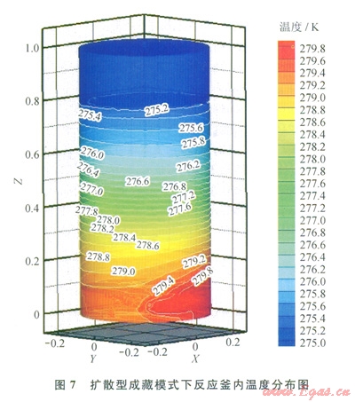 滲漏型成藏模式中,游離甲烷氣以0.1g/s的流速自底部進(jìn)氣口進(jìn)入反應(yīng)釜內(nèi),并迅速擴(kuò)散至整個(gè)底部氣囊(0~100mm高度區(qū)間)。經(jīng)過(guò)氣囊緩沖,氣體的流速顯著降低。由于氣體熱容較低,當(dāng)氣體離開(kāi)底部氣囊滲流進(jìn)入沉積層時(shí),溫度已被U型管加熱至280K。因此,在沉積層底部靠近氣囊的區(qū)域,傳熱方式為甲烷氣與沉積層顆粒之間對(duì)流傳熱和底部氣囊與沉積層整體之間的導(dǎo)熱。隨著甲烷氣在滲流過(guò)程中溫度迅速降低,對(duì)流傳熱作用減小,導(dǎo)熱逐漸成為主要傳熱方式。因此,在圖6中沉積層區(qū)域底部的等溫線受滲流影響有明顯的起伏,而隨著位置的升高,起伏現(xiàn)象逐漸消失,等溫線與底面平行。沉積層整體高度為700mm,底面的溫度為278.8K,頂層溫度為276K,整體溫差2.8K,溫度梯度折合為4K/m,與表1中凍土帶水合物藏地溫梯度符合l:l00的比例,略小于海底水合物藏溫度梯度,但也可通過(guò)改變給熱溫度加以修正。