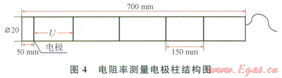 電阻率測(cè)量電極柱為自行設(shè)計(jì),尺寸Æ20mm×700mm(圖4)。電極柱桿體材質(zhì)選用聚四氟乙烯,5根鍍銀銅導(dǎo)線在桿體上環(huán)繞一周形成5個(gè)環(huán)狀測(cè)量電極,相鄰環(huán)狀電極間距l50mm。將相鄰2個(gè)環(huán)狀電極接入電路,即可測(cè)量環(huán)狀電極間所夾介質(zhì)的電阻,進(jìn)而可換算出所夾介質(zhì)的電阻率。系統(tǒng)共配備有這樣的測(cè)量電極柱6根,共30路測(cè)量電極,可測(cè)量24路電阻率數(shù)據(jù)。